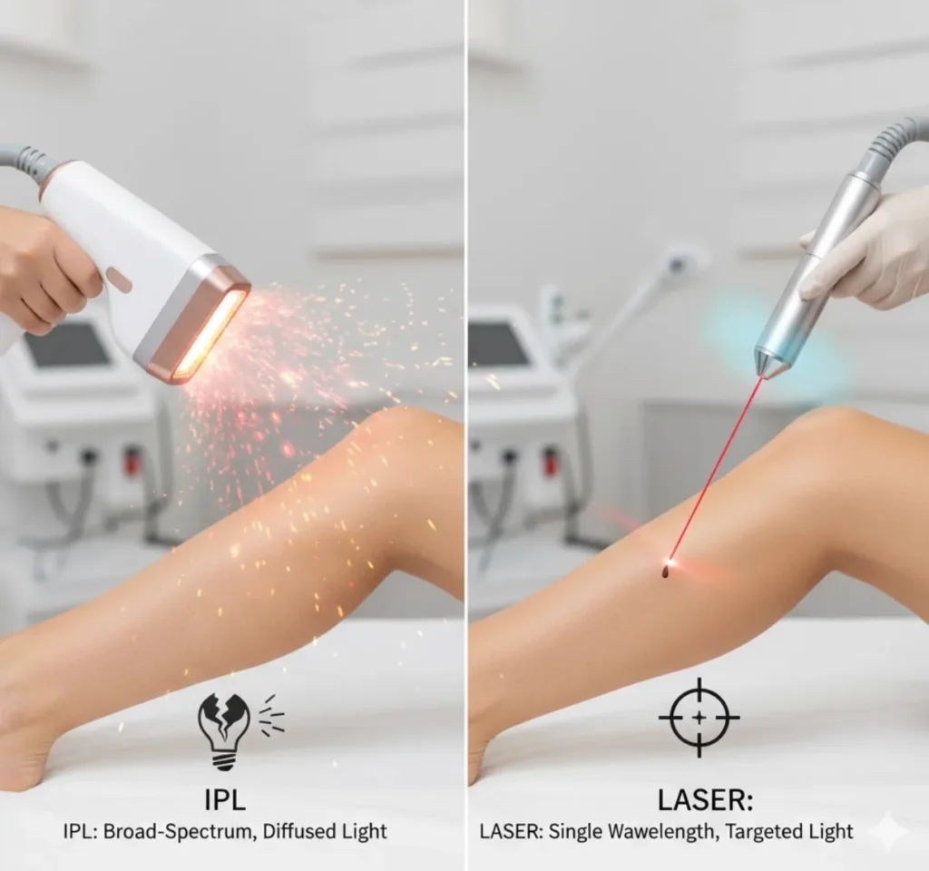 Laser Hair Removal: Laser, on the other hand, is a sniper. It emits a single, intensely concentrated wavelength of light that is precisely aimed to hit the hair follicle and nothing else. This precision makes it incredibly powerful and effective, as all of its energy is focused on one job: disabling that follicle.